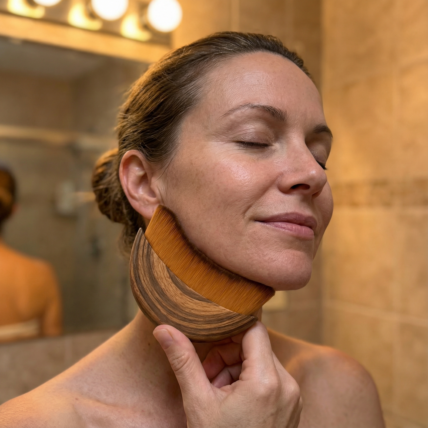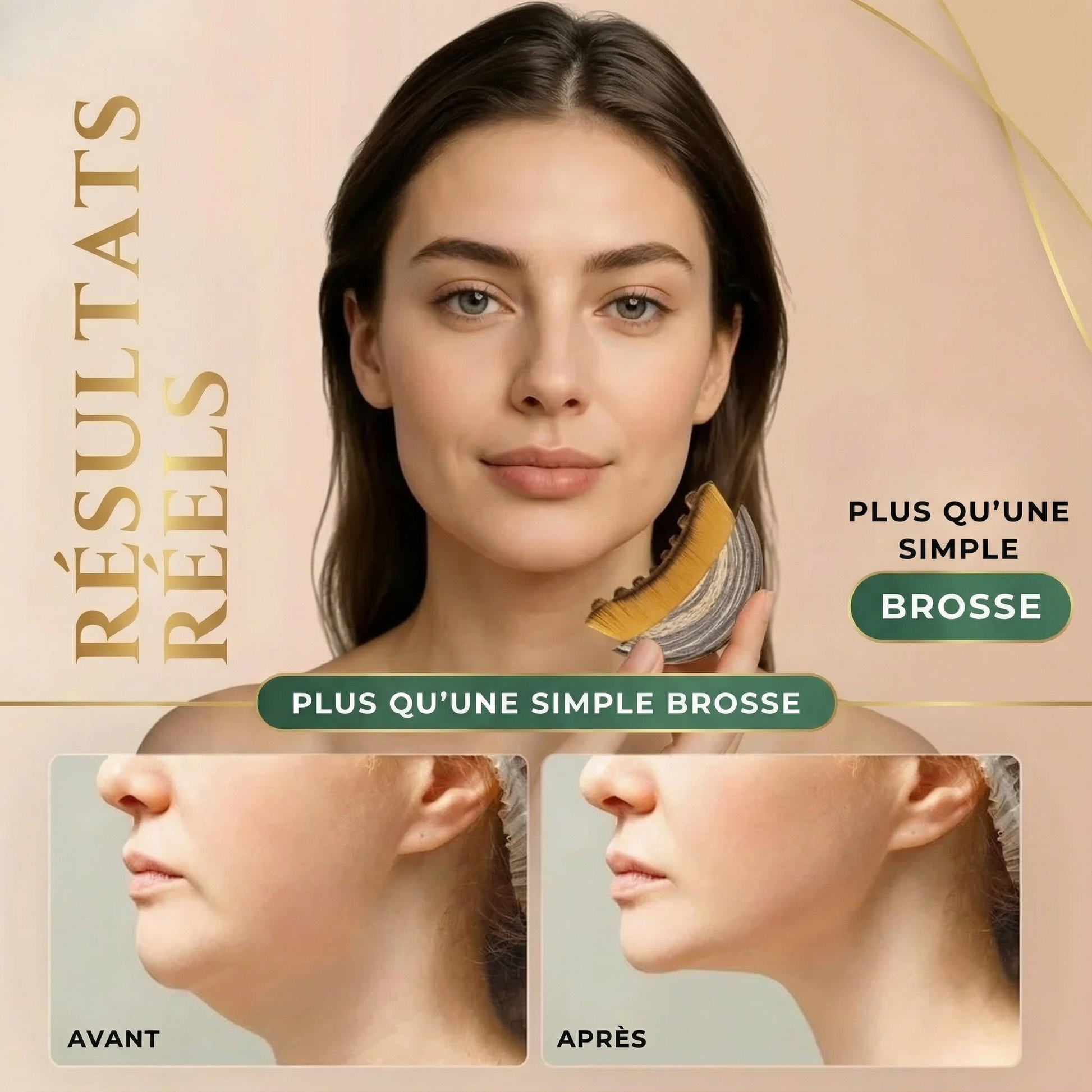 Évite les soins spa coûteux et les outils Gua Sha rigides. Cette brosse lymphatique aux poils doux chouchoute ta mâchoire en seulement 2 à 4 minutes en aidant à libérer les fluides stagnants. Commence au niveau des clavicules, remonte le long de la mâchoire puis redescends le long du cou. S’utilise totalement à sec — avec un effet visiblement raffermissant